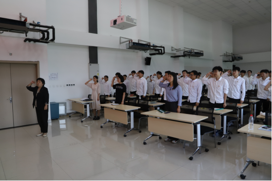 党课开始前,马红健老师带领大家重温入党誓词。“我志愿加入中国共产党,拥护党的纲领,遵守党的章程……”在马红健老师的带领下,69名毕业生党员佩戴党徽,面对鲜红的党旗,举起右拳,庄严宣誓。每一位党员字字铿锵、心潮澎湃,回顾了自己在入党宣誓时的庄严承诺和坚定信念。