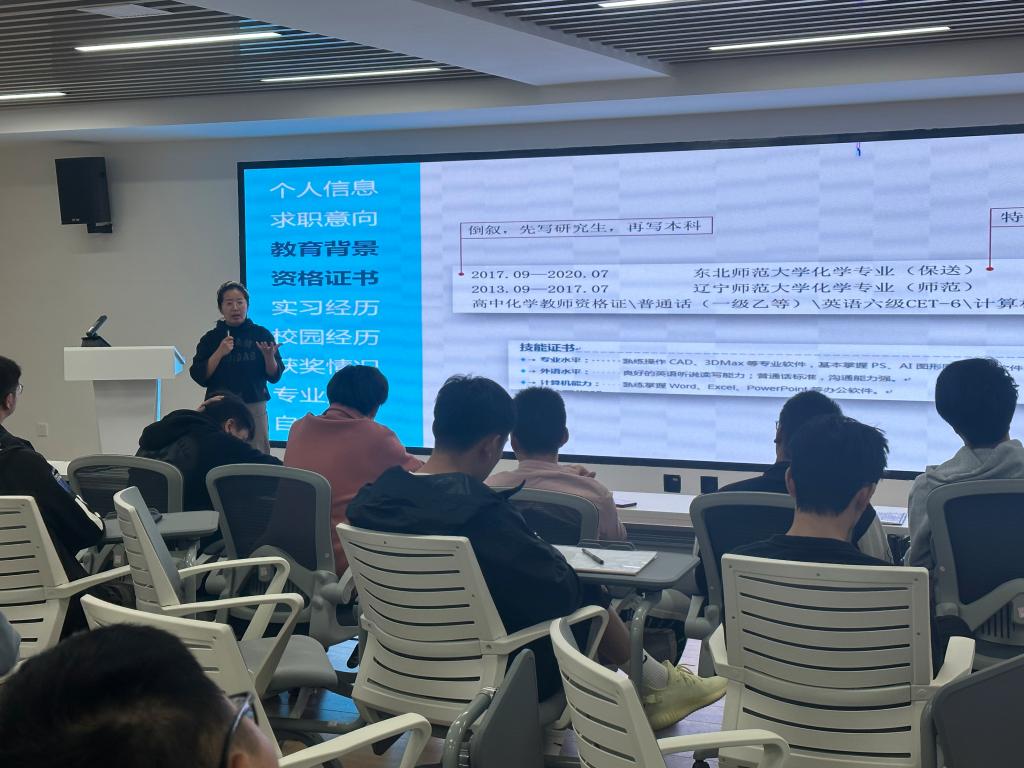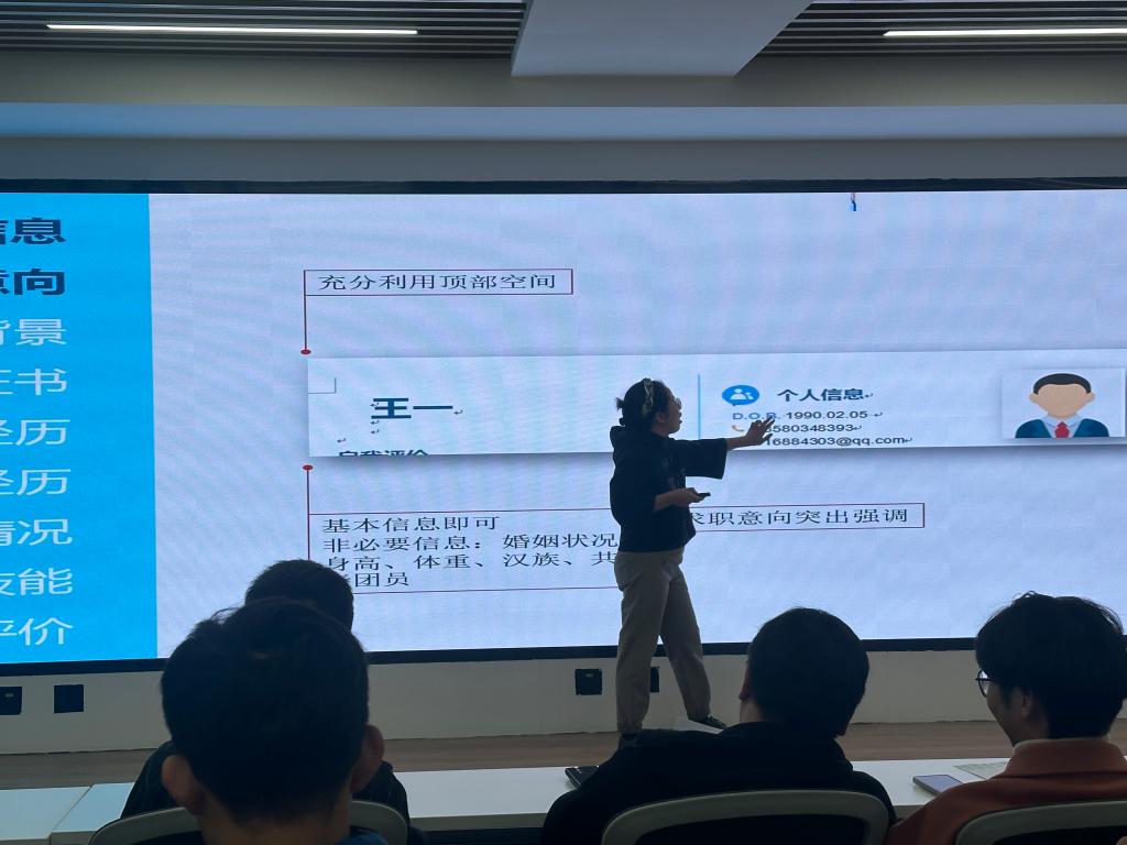 王彦媚老师结合当前就业形势政策,围绕简历撰写制作,从认识简历、制作简历到投递简历展开,主要从个人信息、求职意向、教育背景、资格证书、实习经历、校园经历、获奖情況、专业技能、自我评价九个方面讲解“如何制作一份亮眼的简历”这一问题,要点突出,现场气氛活跃。同时,王老师希望同学们认真完善简历,在未来求职之路上交出一份合格的简历,顺利就业。讲座结束后,王老师还对参加讲座的毕业生简历进行了“一对一”的诊断与精修。