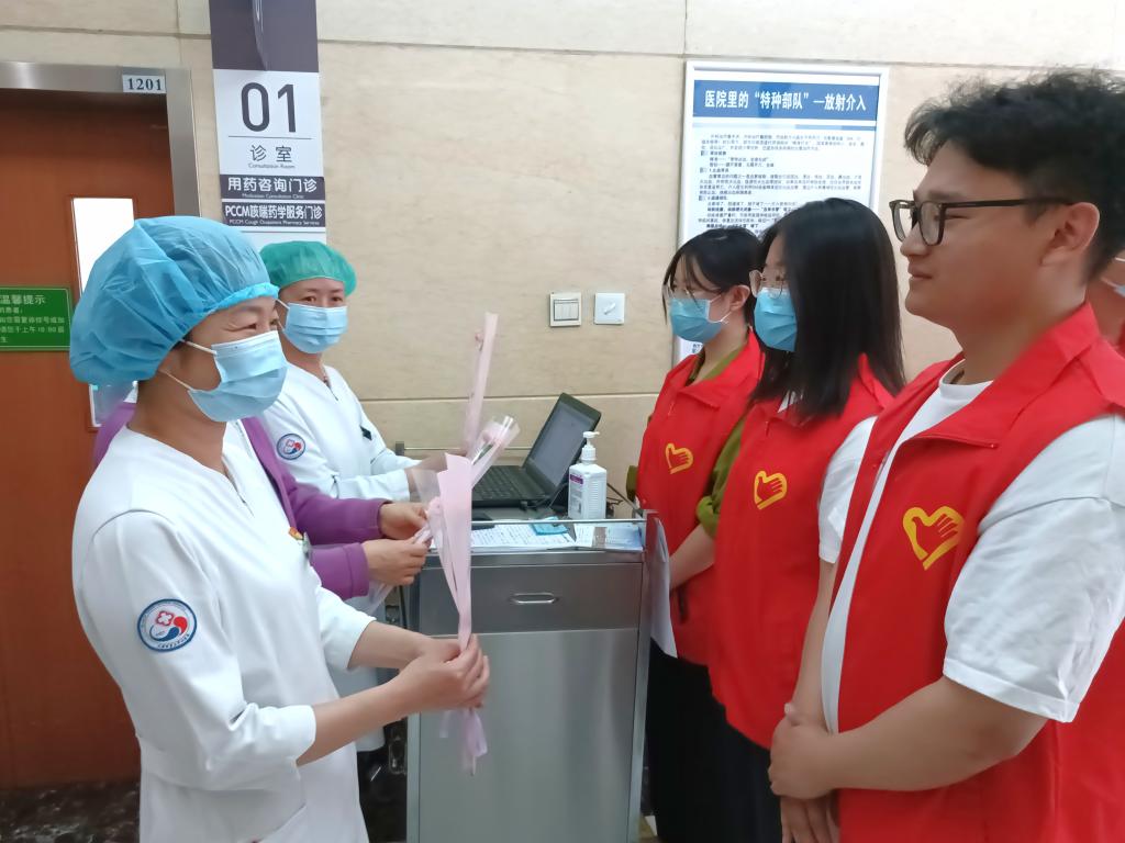 参观学习后,志愿者在医院门诊大厅,将象征着热爱与尊敬的康乃馨鲜花献给工作岗位上的护士姐姐,并送上最真挚的节日祝福。