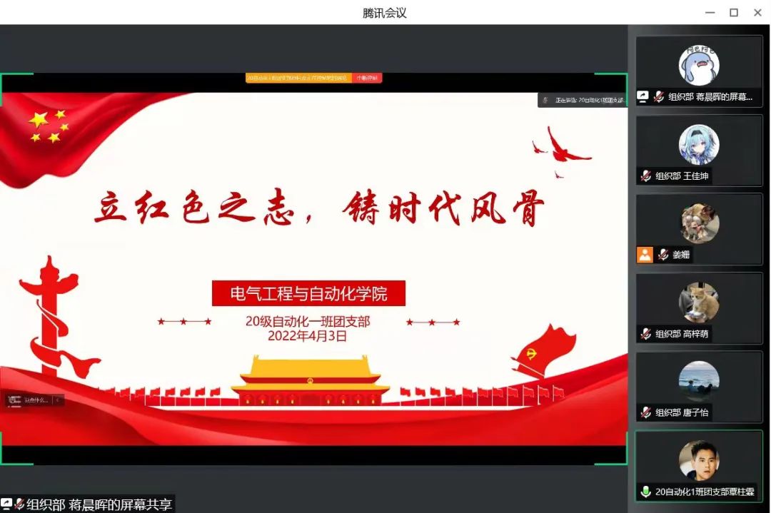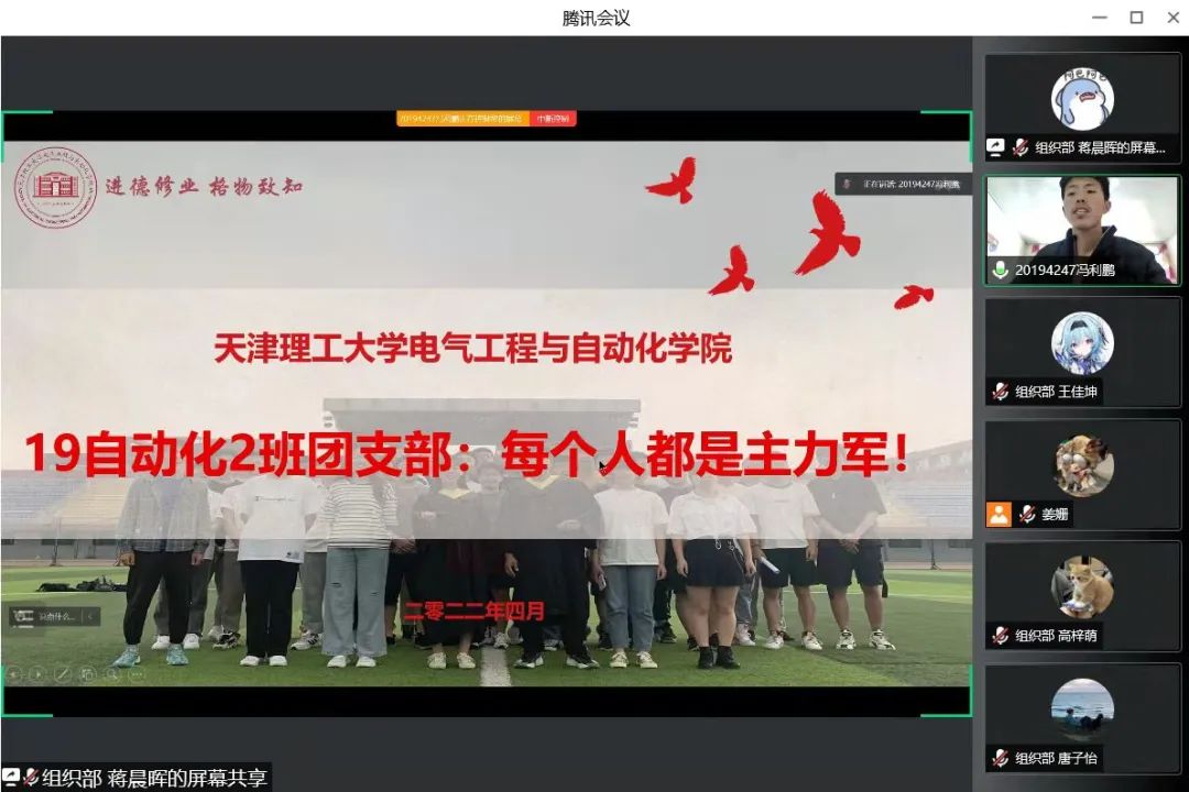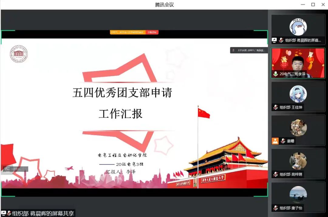 经过前期自主申报、民主评选等环节最终11个团支部进入最后的评选会,各支部代表通过PPT、视频等多重形式展示过去的一年内支部在政治思想建设、班子组织基础、团内联系服务、团员工作奉献等方面取得的成果;在展示过程中,各支部抓住重点、突出特色,将科创成绩、志愿服务时长、“返”家乡实践等融合在支部风采中,重点展示了青年团员在疫情防控中的模范带头作用。最终,19级测控1班、19级自动化2班、20级自动化3班、20级自动化2班、20级电气3班共5个团支部在评选中脱颖而出,拟评选为2021-2022年度优秀团支部,牛子璇、刘向宣、卢冀宁等20名同学拟获评优秀共青团团干部,陶纪中、李博、赵婧涵等40名同学拟获评优秀共青团员。