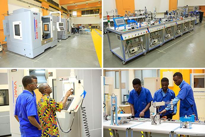 建成的科特迪瓦鲁班工坊占地805平方米,建有大型设备车间(实训场地)1个,实验室3间、实验教学和学习教室3间,教研室1间。配备大型设备5个种类11台套、中小型仪器设备16个种类87台套,以及实验台、投影仪等辅助教学设备。