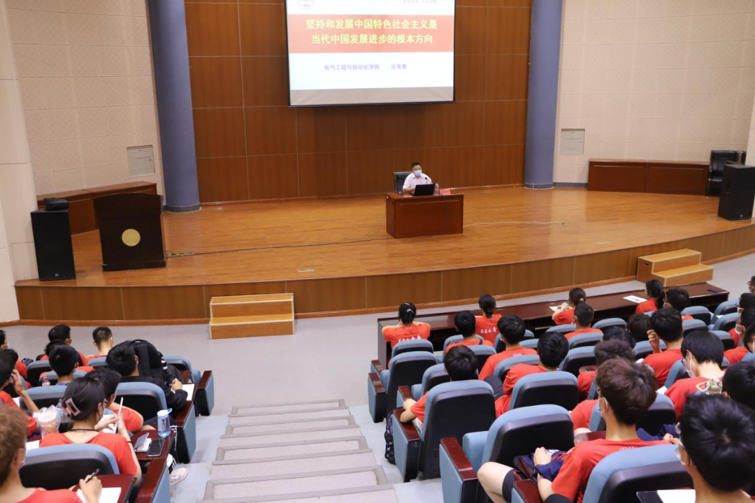 谷老师以《坚持和发展中国特色社会主义是当代中国发展进步的根本方向》为题,从党的性质、宗旨、指导思想出发,通过介绍新时代党和国家事业取得的历史性成就、发生的历史性变革,详细讲解了党章的主要内容;同时围绕党的百年奋斗史,深入阐述了中国共产党为什么能、马克思主义为什么行、中国特色社会主义为什么好以及新时代如何坚持和发展中国特色社会主义等,进一步加深了同学们对党的认同感和归属感。