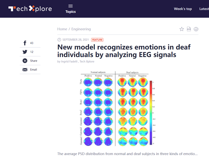 近日,国外科技媒体Tech Xplore对公司高强教授和董恩增教授情感计算与智能机器人团队的最新研究成果—“基于脑网络的聋人情感识别方法”进行专题报道。Tech Xplore是Science X旗下的科技网站,刊载内容主要涵盖工程、电子和技术发展等前沿领域最新研究。Science X是一个提供每日科学、研究、技术的高质量新闻媒体,覆盖面广,每月全球读者多达500万,包括科学家、研究人员和工程师等。