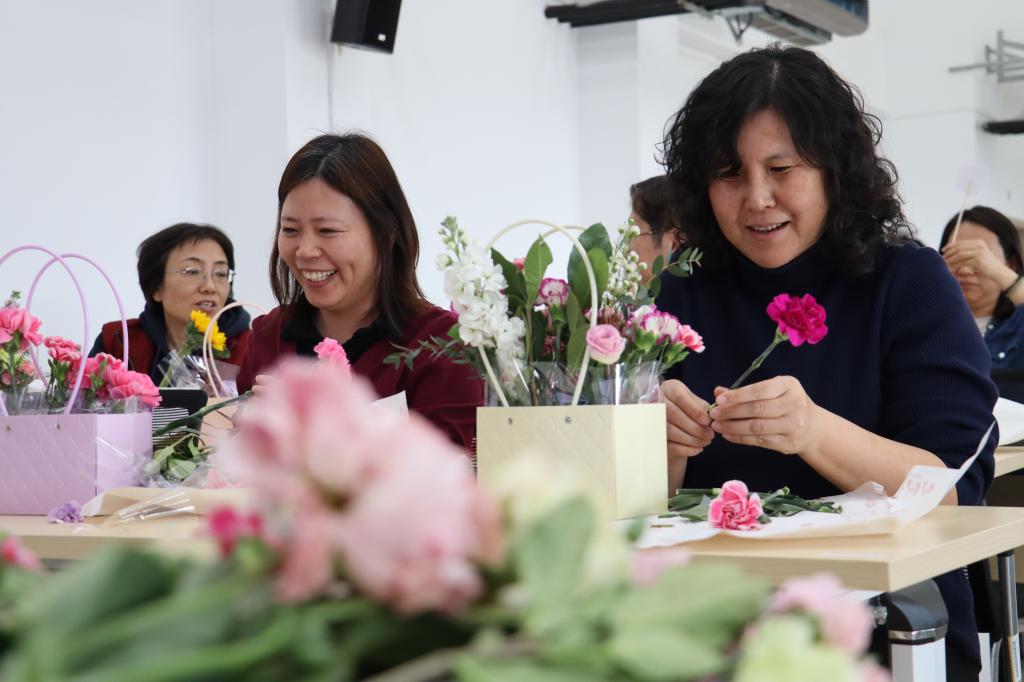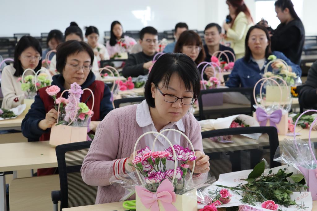 活动现场花香四溢,色彩斑斓的花卉与精致的装饰相得益彰。教师们在专业花艺师的指导下制作花艺作品。大家围坐在一起,一边聆听花艺知识讲解,一边精心修剪枝叶、搭配色彩,将一朵朵鲜花组合成富有创意与美感的花艺作品。整个过程中,教师们相互交流、分享心得,现场洋溢着欢声笑语。