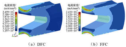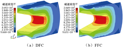 图4 动态摩擦系数(DFC)与摩擦系数为固定值0.24(FFC),且电枢速度为370m/s时的电枢电流密度和磁场分布