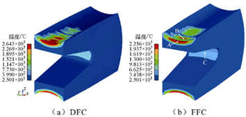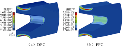(a) 电枢速度为370 m/s时的温度分布 (b) 电枢速度为1120 m/s时的温度分布